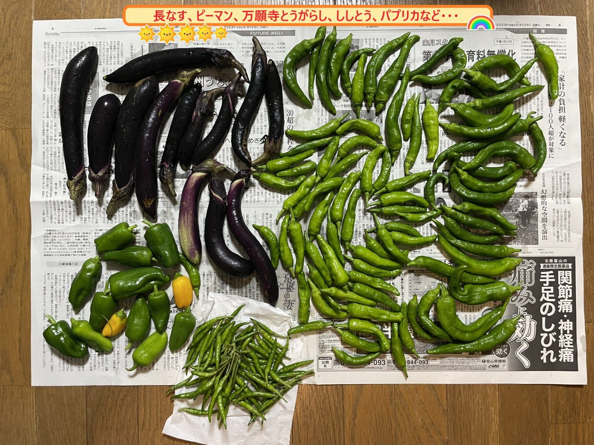 今年から始めた市民農園で今日も野菜を収穫しました。今回はなす、ピーマン、万願寺とうがらし、ししとう、唐辛子、パプリカです。採れたてはとっても美味しいですが豊作すぎて食べきれないのでいつもご近所におすそ分けしてます。夏野菜もそろそろ終わりかなー。